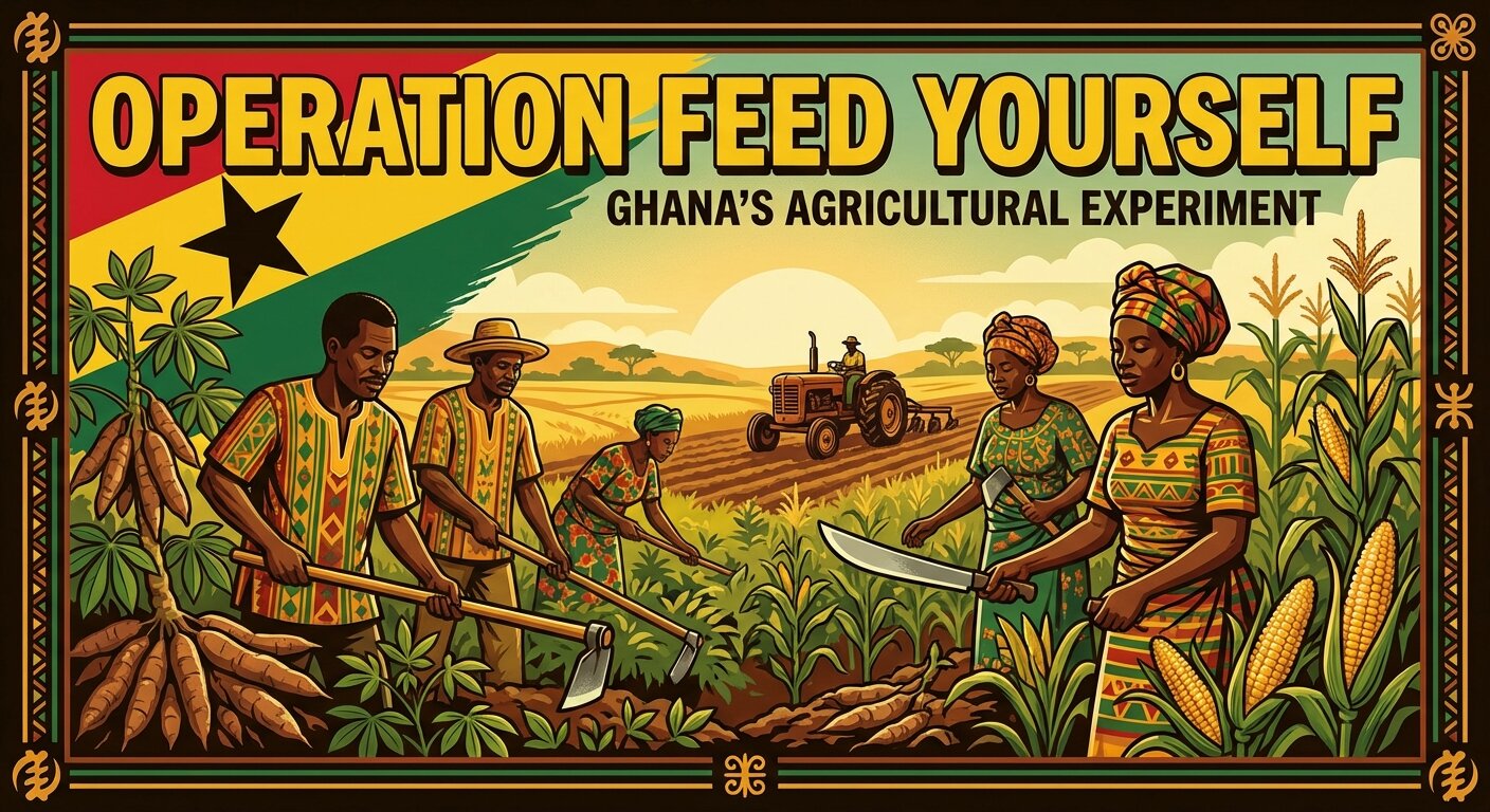 In February 1972, barely a month after seizing power, Acheampong launched Operation Feed Yourself (OFY), Ghana's most ambitious agricultural programme since independence. The ideological basis was self-reliance β a conscious rejection of the colonial agricultural structure that had oriented Ghana's farming toward export crops (cocoa, palm oil, rubber) for European markets while the country imported rice, wheat, and sugar. As Stefan Meier documented in his 2012 University of Basel thesis, OFY aimed to "correct the image of a beggar nation" and transform Ghana from a food importer into a self-sufficient producer.